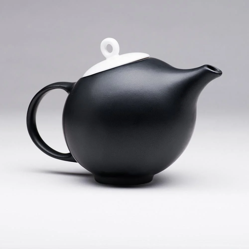 Maia Ming exquisite full tea service in black matte stoneware with glossy white lids – a testament to elegance and functionality in your tea-time rituals. Inspired by the renowned ceramics of Eva Zeisel, our teaset embodies her timeless design philosophy, captivating both the hand and the eye with its simplicity and grace.